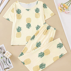 Повседневный Женский комплект одежды для сна с принтом фруктов, топ с короткими рукавами, подходящие шорты, можно стирать на все сезоны на лето