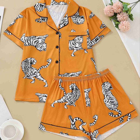Hot Bán Phụ Nữ Của Quần Áo Ngủ Thiết Lập Trong Vương Quốc Anh Với Tiger In Ngắn Tay Đầu Và Quần Short, Thích Hợp Cho Tất Cả Các Mùa