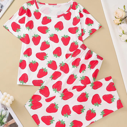 Phụ Nữ Giản Dị Của Ngủ Set Với Trái Cây In Ngắn Tay Đầu Phù Hợp Với Quần Short Máy Có Thể Giặt Cho Tất Cả Các Mùa Cho Mùa Hè